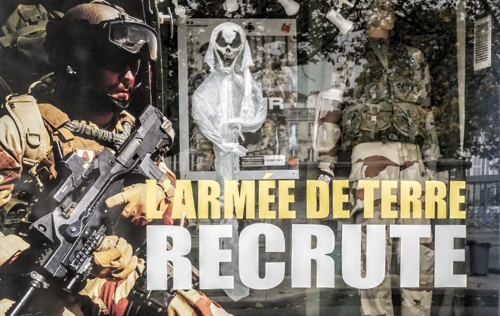 Es gab aber auch Sonderbares in der Stadt: ein Gespenst zwischen martialischen Kämpfern. Ist das ein spezieller Humor der Mitarbeiter des Rekrutierungsbüros der Armee oder einfach nur Gedankenlosigkeit.