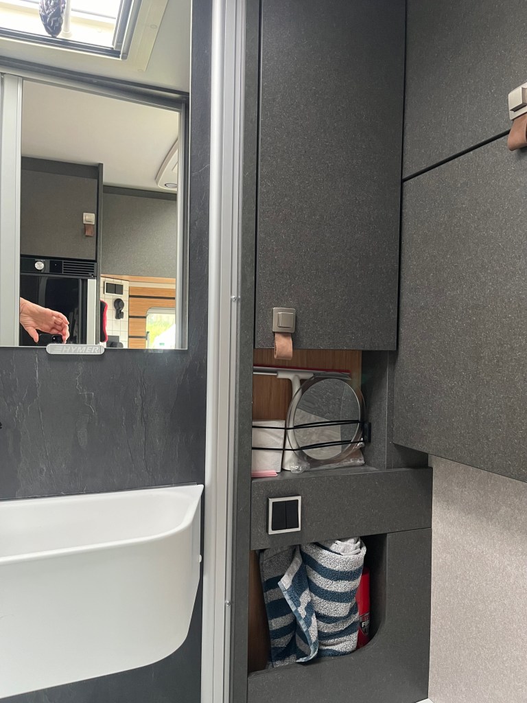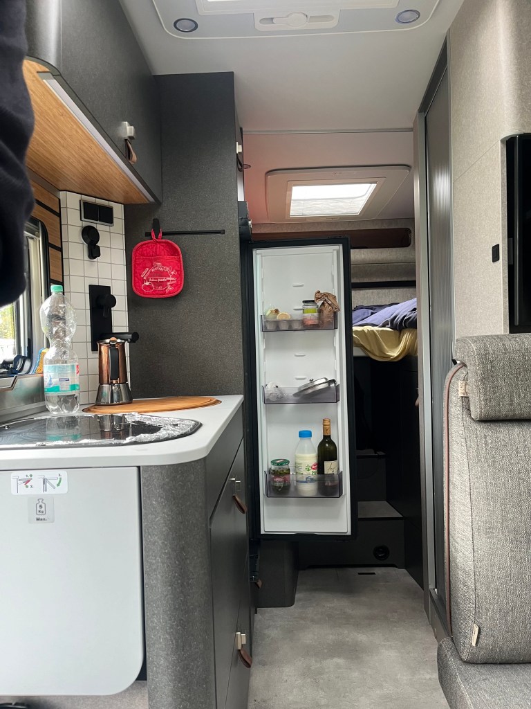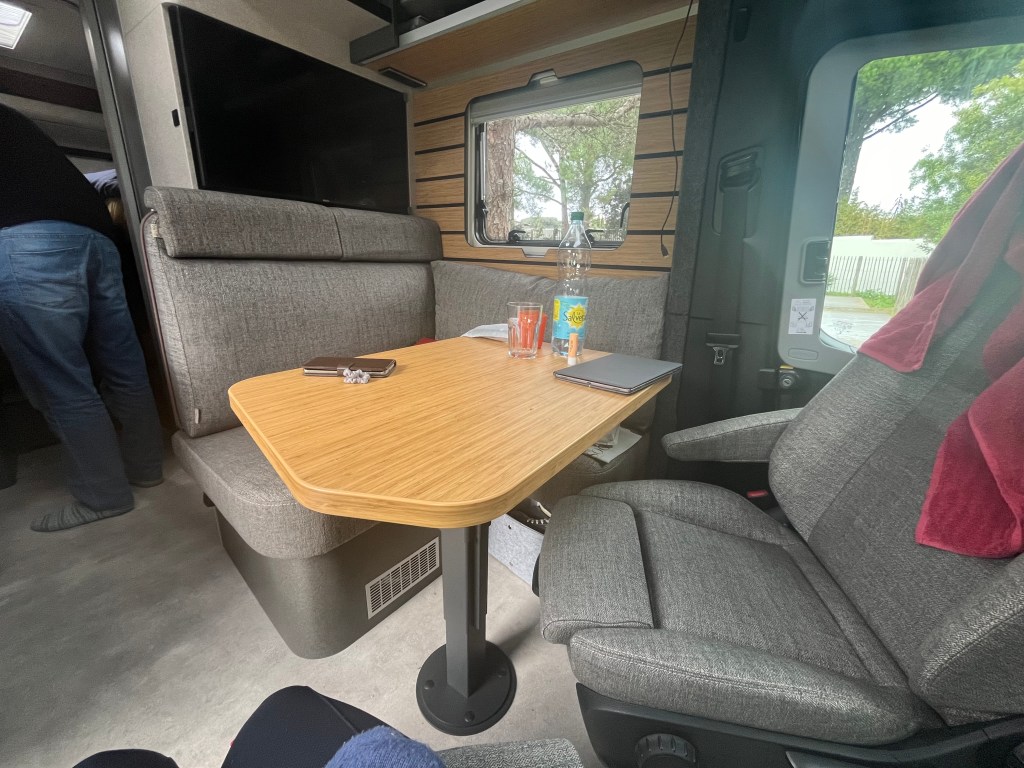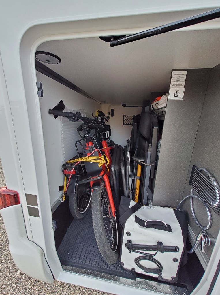 Nun sind wir schon vier Wochen unterwegs und wir haben uns sehr gut in unserem Kärrele eingelebt. Nach jeder Wanderung oder Radtour freuen wir uns auf unsere gemütliche kleine „Wohnung“ und den Gedanke ständig die Unterkunft wechseln zu müssen und ein- und auszupacken, können wir uns gar nicht mehr vorstellen. Und es passiert oft, dass wir mit Plänen starten, die wir ganz schnell ändern. Das wäre ohne die Unabhängigkeit mit einem Wohnmobil nicht möglich. Die Größe von 6,70m hat sich bewährt. Es gibt ein großes Bett und trotzdem haben wir Platz zum Wohnen. Auch die Schränke sind vollkommen ausreichend – tatsächlich könnten wir noch einiges mehr unterbringen. Das scheitert allerdings am Gewicht. Denn mehr als 3,5t dürfen wir nicht auf die Waage bringen und wir sind mit 3,45t gestartet.