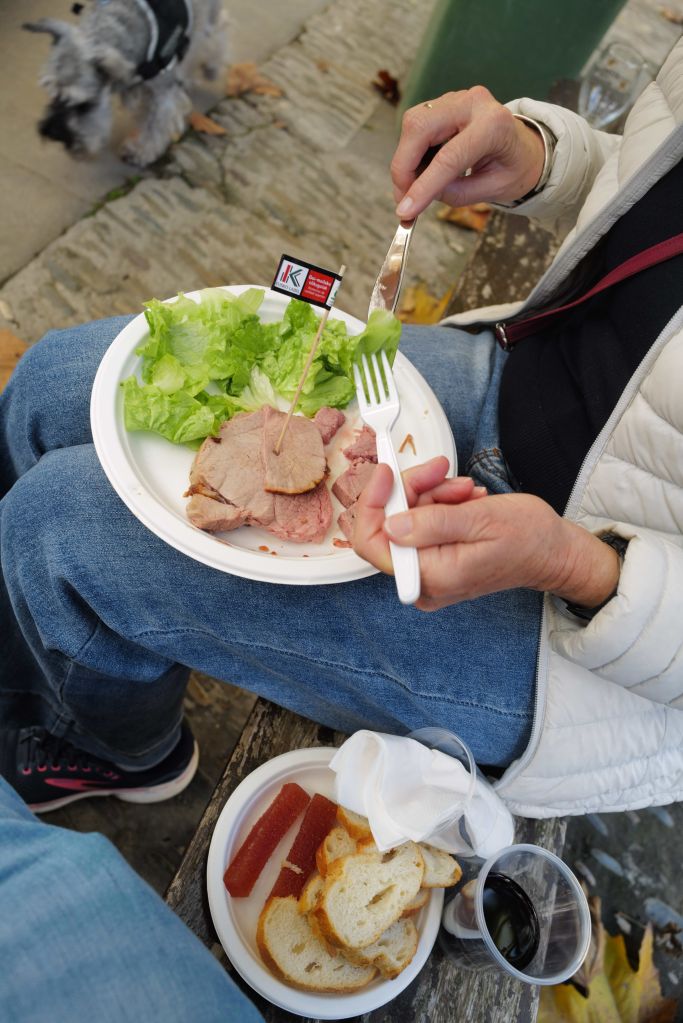 Es war Wochenende und wir hatten das Glück ein typisches Dorffest zu erleben. Für 8 Euro bekamen wir Wein, Käse und Quittenbrot und gegrilltes Rind mit Salat. Die Schlange war enorm, denn gefühlt war der ganze Ort anwesend und hat sich mit Essen auch noch für den nächsten Tag eingedeckt.