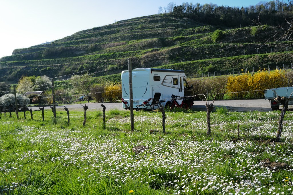 Den Kaiserstuhl kennen wir bisher nur indirekt über das eine oder andere Weingut, jetzt bietet sich die Gelegenheit die Gegend zu erkunden. Das Wetter spielt mit und wir genießen ein erstes Glas Wein in der Vinothek vom Weingut Abril. Leider sind die Stellplätze bereits vergeben, so dass wir auf den Gemeindestellplatz beim Freibad ausweichen.