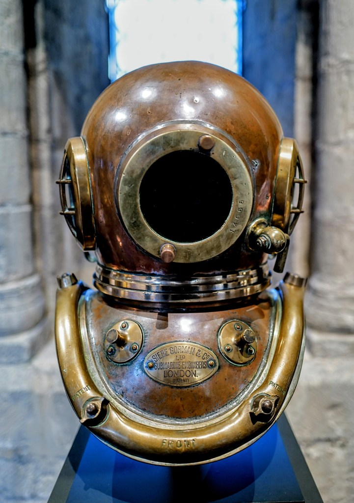 Diese Tauchermaske gehörte William Walker, der die Kathedrale ab 1906 vor dem Einsturz bewahrte indem er das Fundament in jahrelangen Tauchgängen mit Zement stabilisierte. Auch er liegt in der Kathedrale begraben.