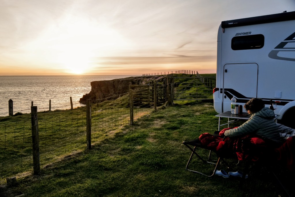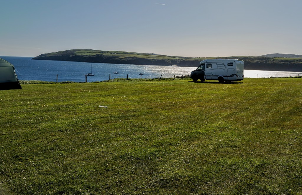 Wenn man sich auf dem Stellplatz in Aberdaron einen Platz direkt an den Klippen sichern kann, schaut man Delphinen in der Abendsonne zu.