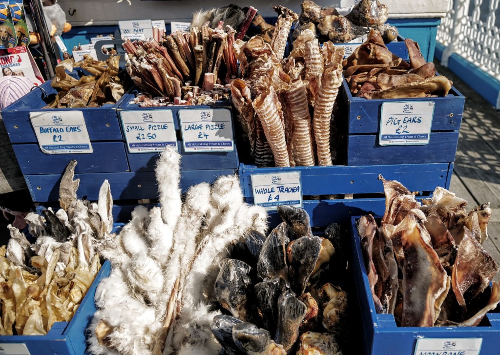 Was heißt Pizzle? Der Name war mir natürlich nicht bekannt, aber der medizinisch geschulte Mitfahrer erkannte die Schwellkörper und damit die anatomische Herkunft der Leckereien. Ebenfalls erhältlich waren Stierhoden, so kann man, wenn man beides kombiniert, bei besonderen Gelegenheiten seinem vierbeinigen Liebling eine Art „Herrengedeck“ servieren.