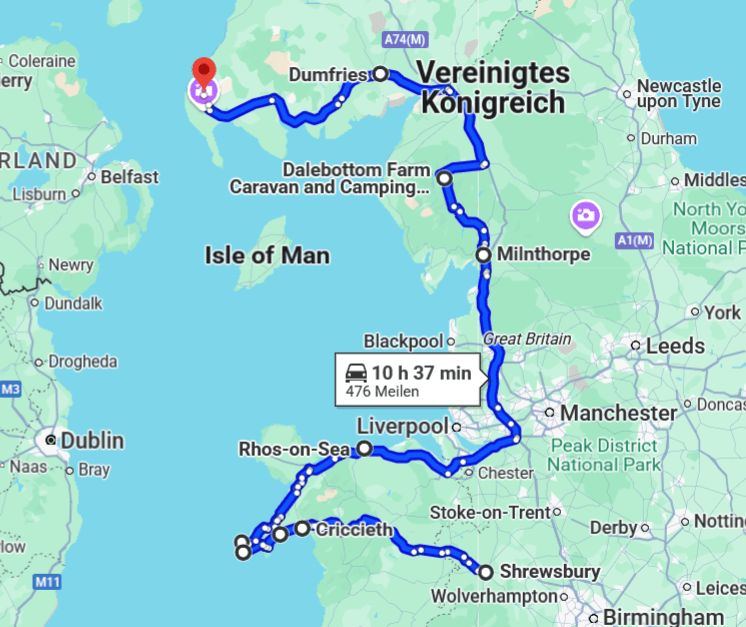 Hier ein Blick auf unsere Reiseroute seit Manchester und wie es bis zur Fähre nach Irland weitergeht