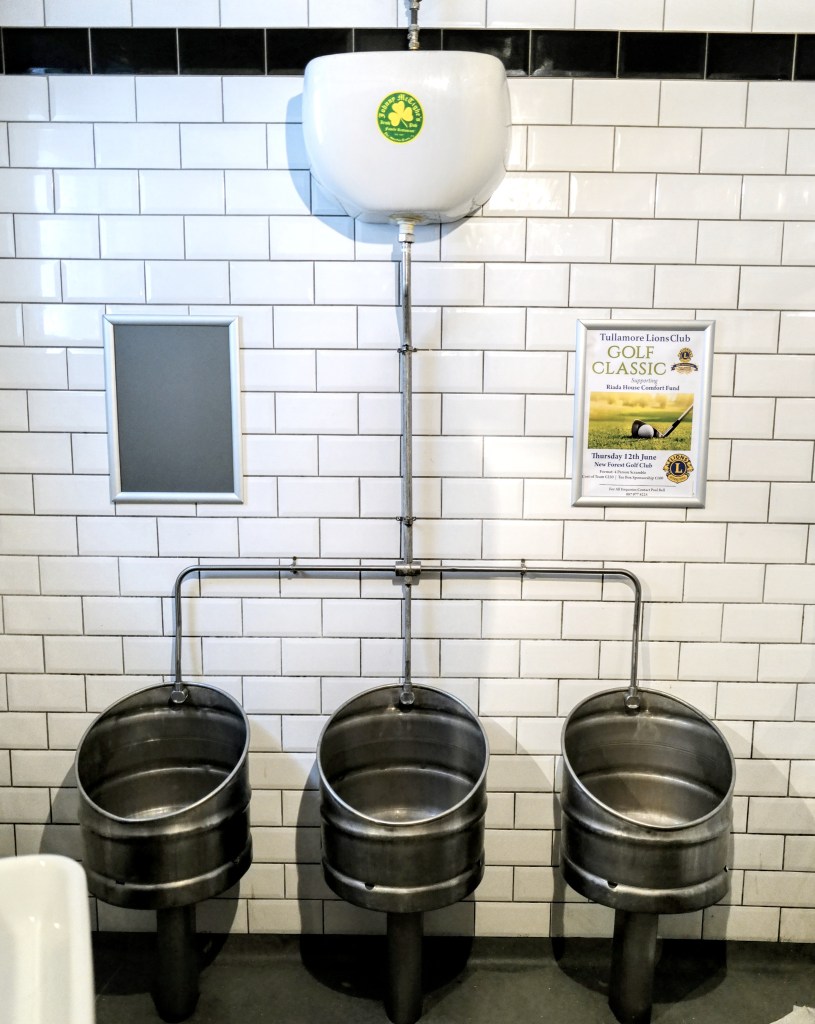 Beherrscht bei uns nach Abschaffung der Pinkelrinne schlichte weiße Keramik namens Ideal Standard das Bild, gibt man sich in Irland deutlich mehr Mühe.