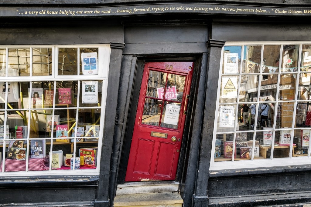 Diese Buchhandlung liegt im Zentrum und bietet neben der interessanten Eingangstür auch einen Spruch von Charles Dickens.
