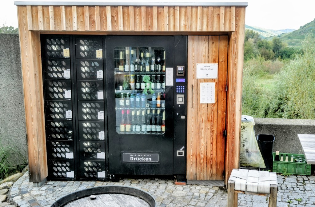 Auch die Alkoholbranche geht mit der Zeit und es finden sich am Donauradweg Automaten mit gekühlten Weinflaschen und Gläsern neben den notwendigen Sitzgelegenheiten, um sofort genießen zu können. Ob dies die Radwege sicherer macht sei mal dahingestellt.