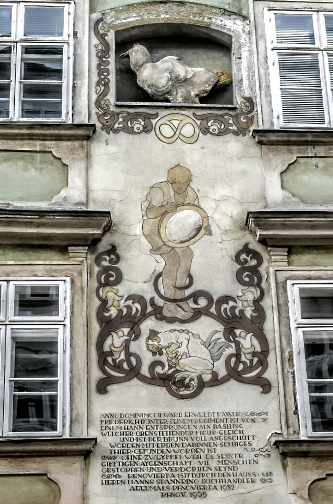 Der Basilisk, eine Kreatur halb Hahn, halb Schlange mit einem Blick, der Tod und Flammen brachte. Die Stadt war verzweifelt, bis ein mutiger Schmied auf die Idee kam einen Spiegel zu nutzen, damit der Blick des Basilisken zurückgeworfen wurde. Der Basilisk sah sich selbst, verbrannte – und Wien war gerettet. Eine Legende über Mut, Einfallsreichtum und den Sieg des Guten über das Böse.