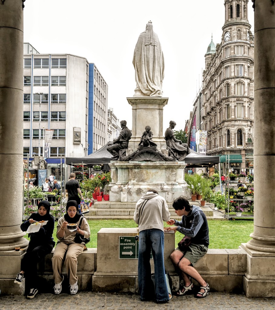 Vor der St George’s Hall stehen die Statuen von Prinz Albert und Queen Victoria. Ihre Krönung war der Anlass zum Bau dieser Halle, die bis heute als Veranstaltungsraum genutzt wird.