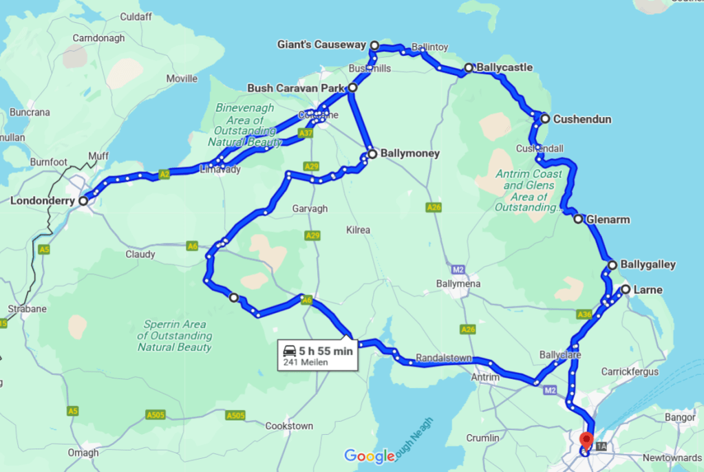 Nach einer kurzen Nacht am Fährhafen, ging es auf ein fast leeres Schiff nach Larne und dann hoch an die Küste.
